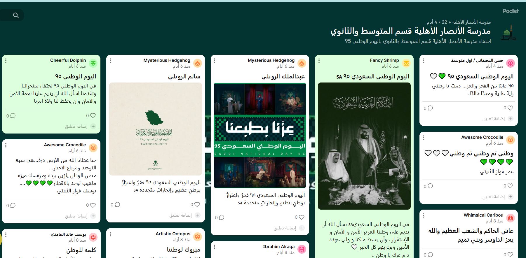 أقامت مدرسة الأنصار الثانوية برنامجاً للاحتفاء بـ ( اليوم الوطني السعودي الـ ٩٥ )، فقد نظّمت المدرسة عددًا من الفعاليات الوطنية الهادفة إلى تعزيز روح المواطنة لدى أبنائها الطلبة، والتي جسّدت أسمى معاني الانتماء والولاء لهذا الوطن المبارك.