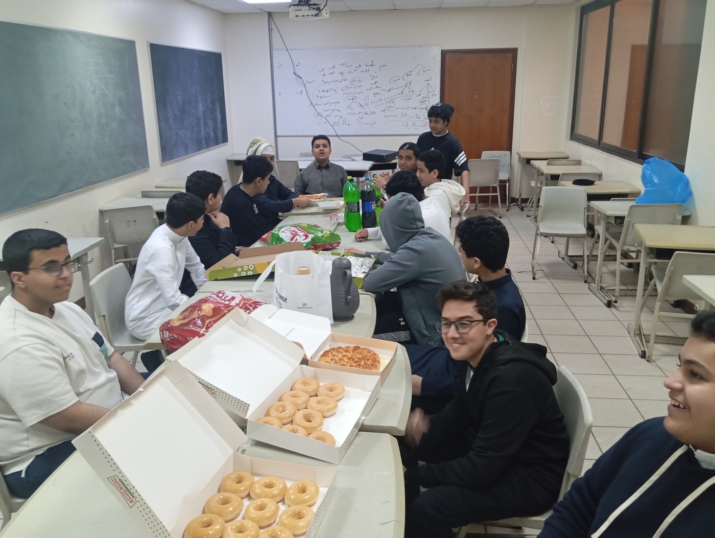 • تم إعداد فطور متنوع بمشاركة جميع الطلاب بجانب المشروبات المختلفة.